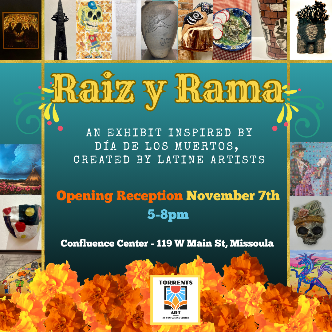 The Confluence Center (Western Montana's Home for Nonprofit Events) art program Torrents is thrilled to present a magical evening of art and community! This month we proudly present the special group exhibition Raiz y Rama (Root and Branch), guest curated by local Latine artist Krissy Ramirez, and meant to coincide with Día de los Muertos .