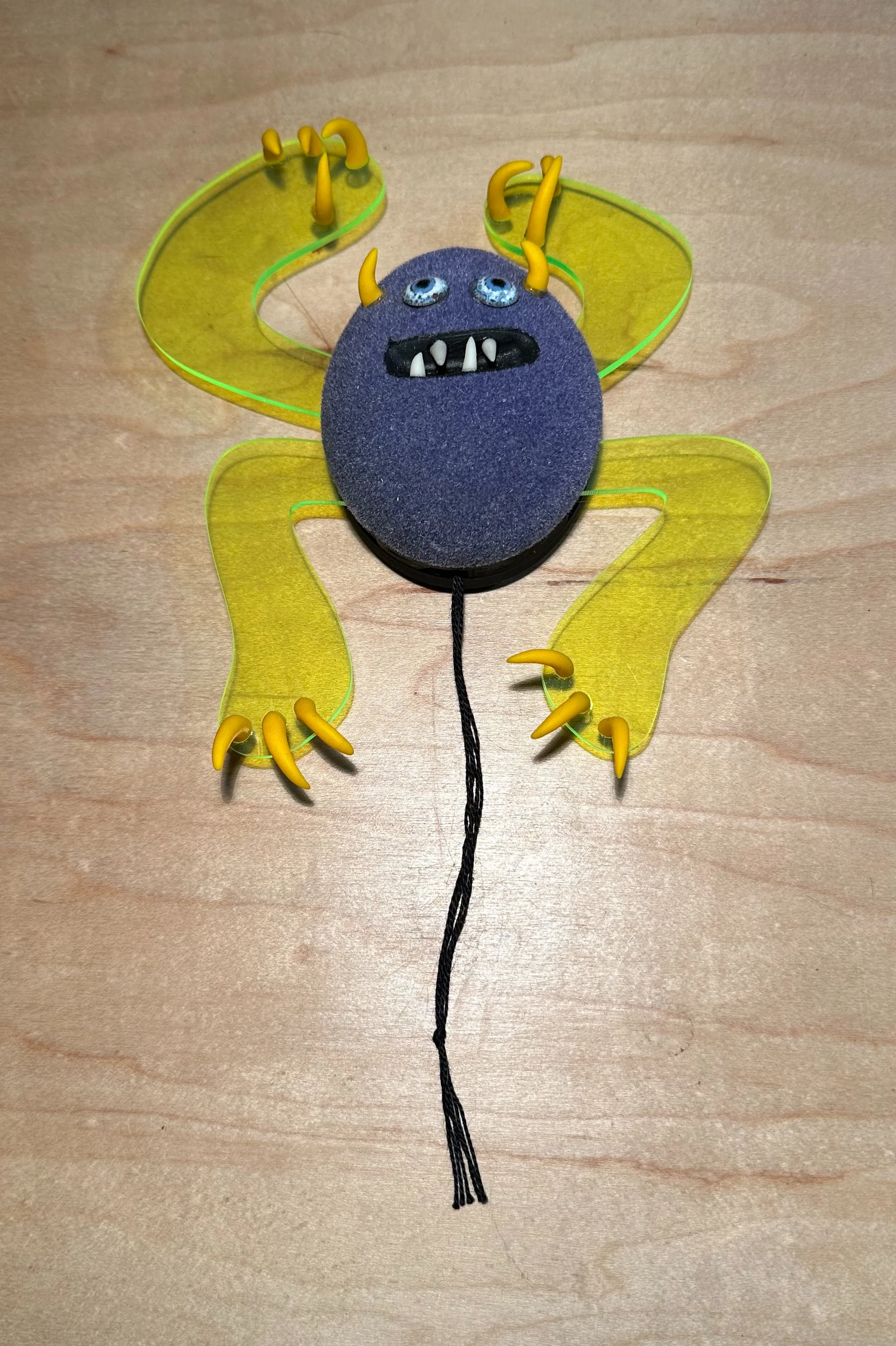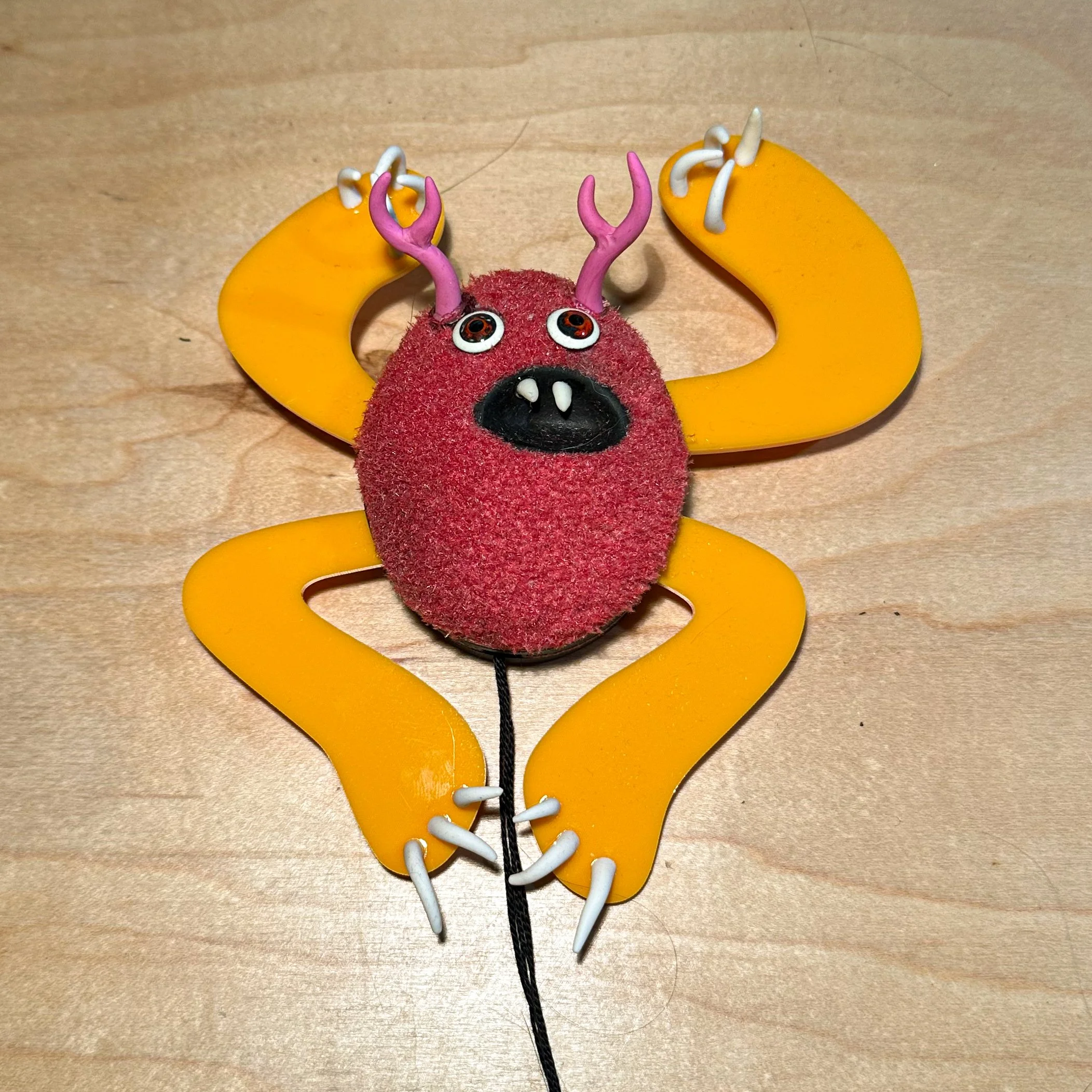 TTMMS - (things that make me smile) wall monster #6, 7”x10”, acrylic , fimo, paper mache, wood, flocking, $150.00