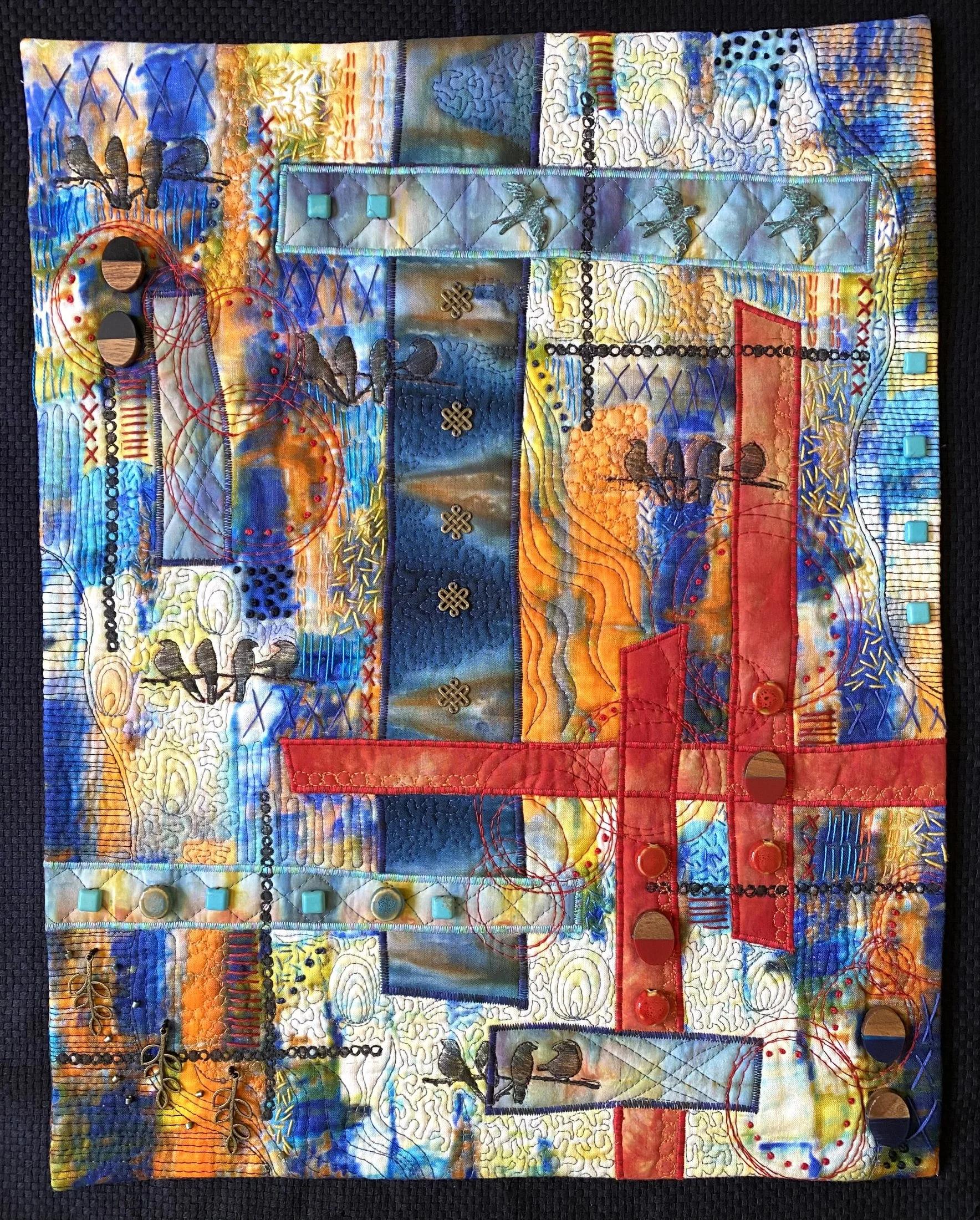 Collage with fabric + stitching no.2, 8”x11”, paper, fabric, thread, $150