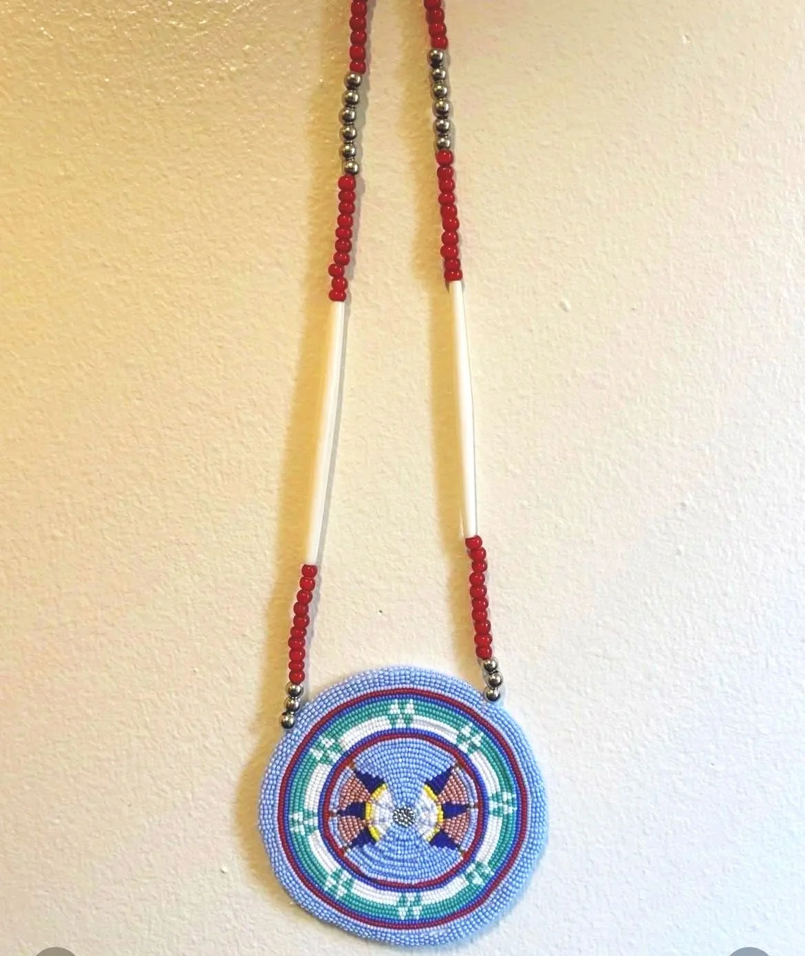 Anpétuwi -Vintage white commercial hide, size 11 charlotte beads, 00 nylon thread, yellow trade bead, 11” x 18”- $450