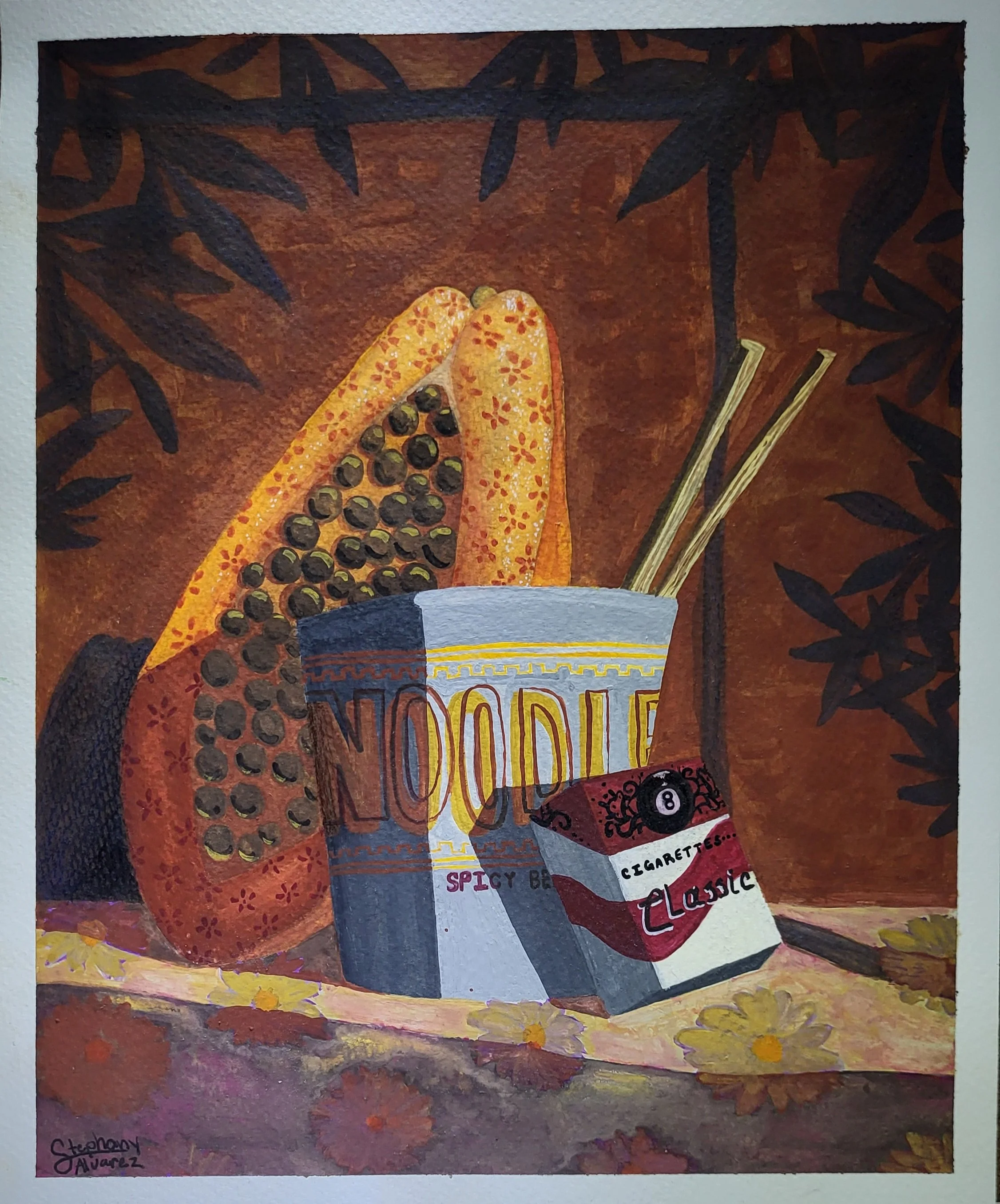 Over Noodles, 17”x14“, Gouache & color pencil, $450